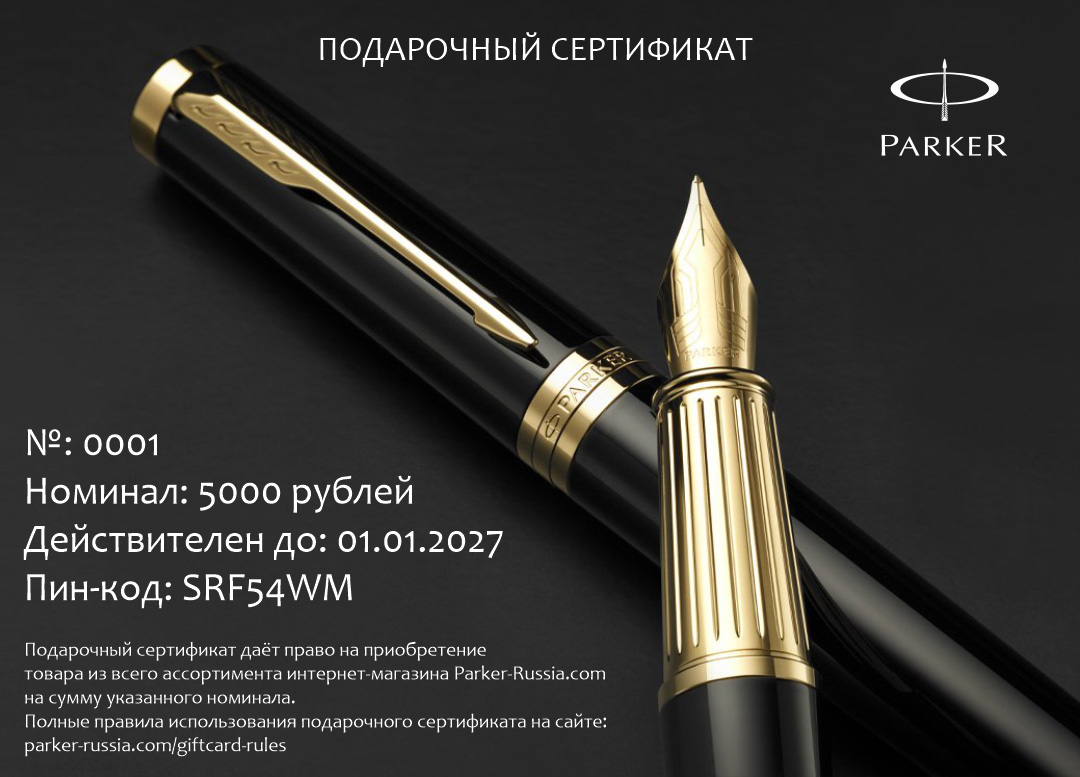 Подарочный сертификат Parker 5000 от официального дилера Parker в Нижнем Тагиле. Вы можете дополнительно заказать гравировку, которая подчеркнет Вашу оригинальность и придаст памятность статусному подарку. Все ручки Паркер поставляются в фирменном футляре.